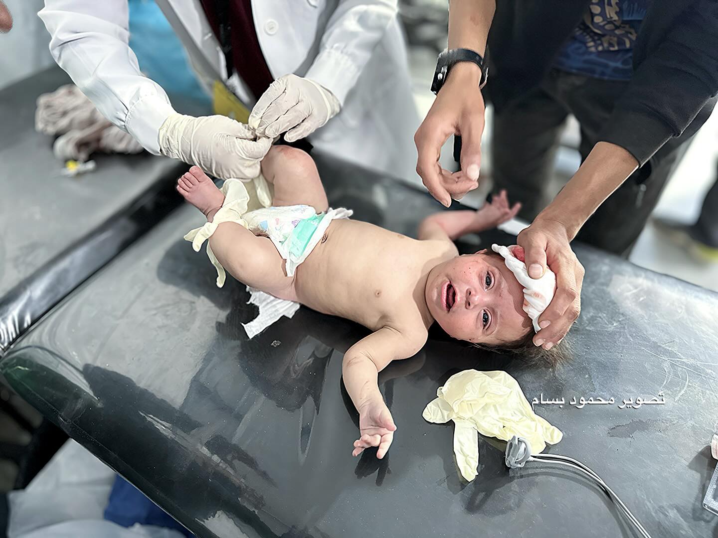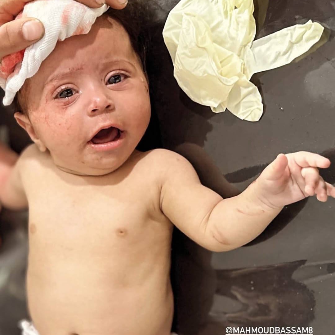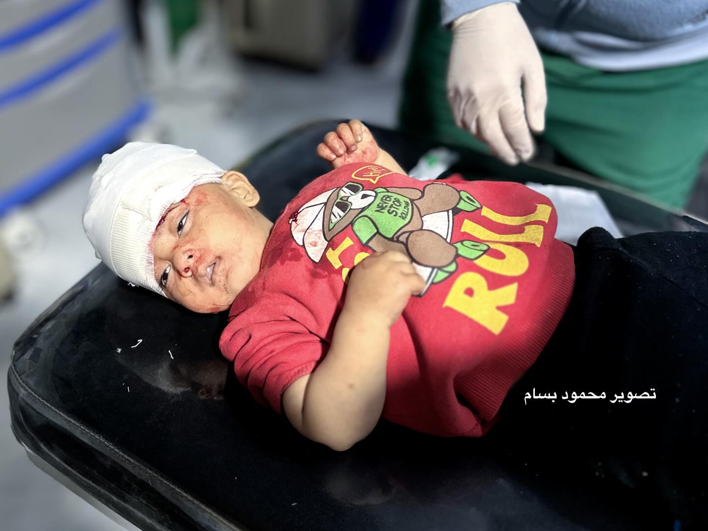 رضيع مصاب يبكي بعد إصابته جراء قصـف إسرائيلي استهدف خيام النازحين في مواصي خانيونس An injured infant cries after being wounded in an Israeli strike that targeted displaced people’s tents in Al-Mawasi, Khan Younis.