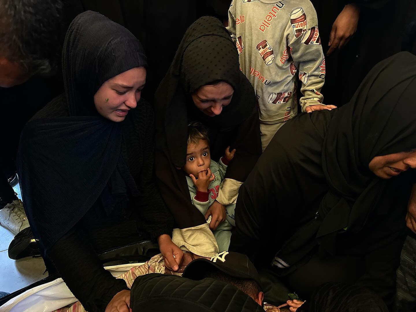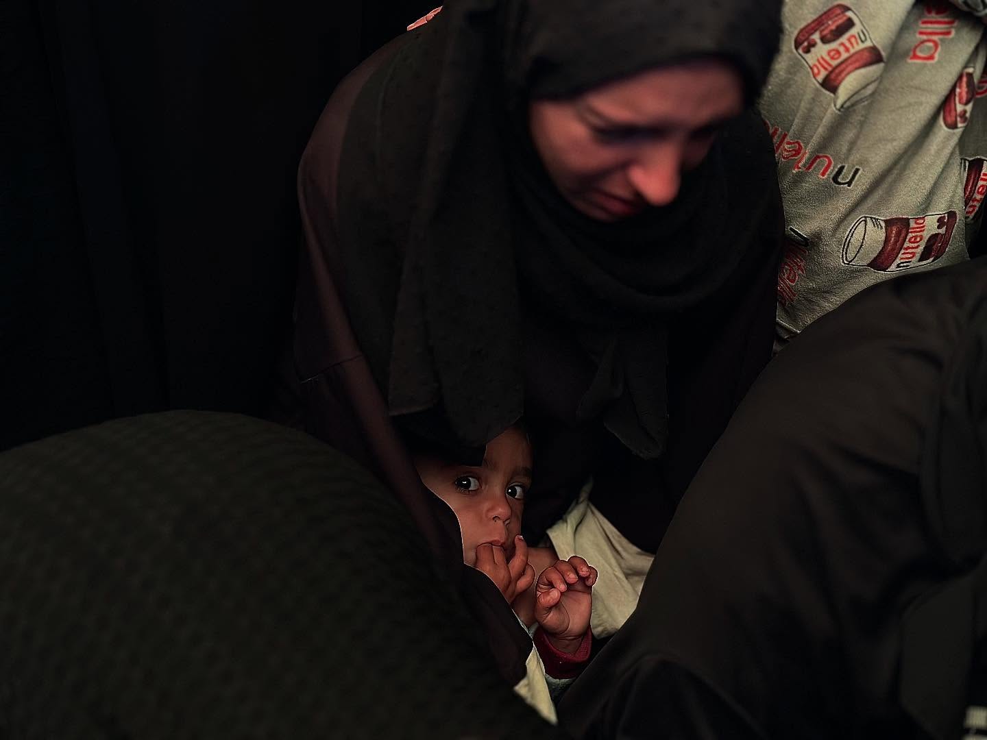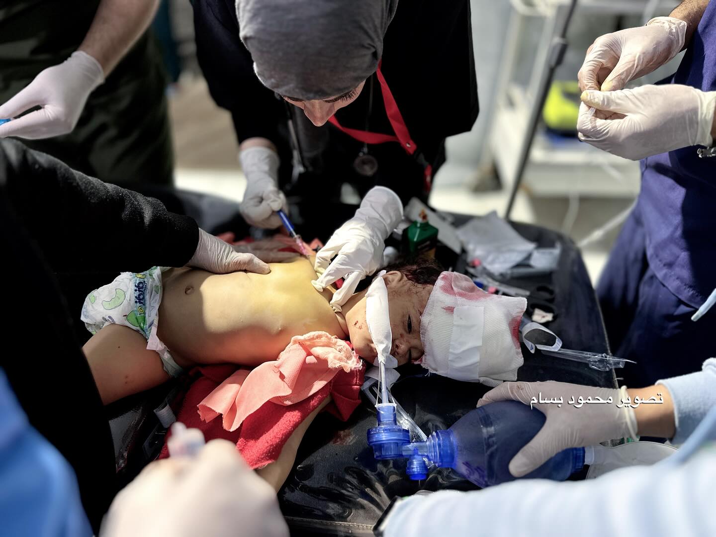 رضيع مصاب يبكي بعد إصابته جراء قصـف إسرائيلي استهدف خيام النازحين في مواصي خانيونس An injured infant cries after being wounded in an Israeli strike that targeted displaced people’s tents in Al-Mawasi, Khan Younis.