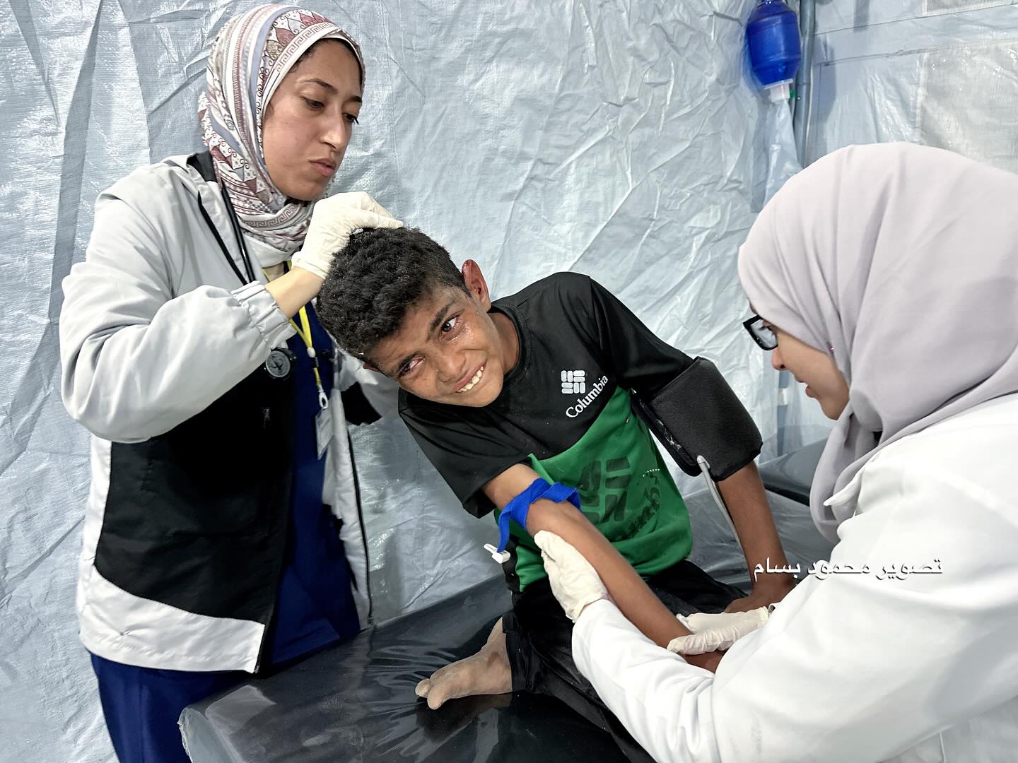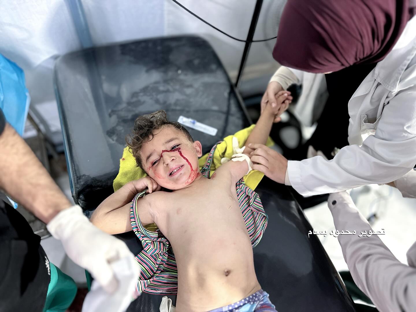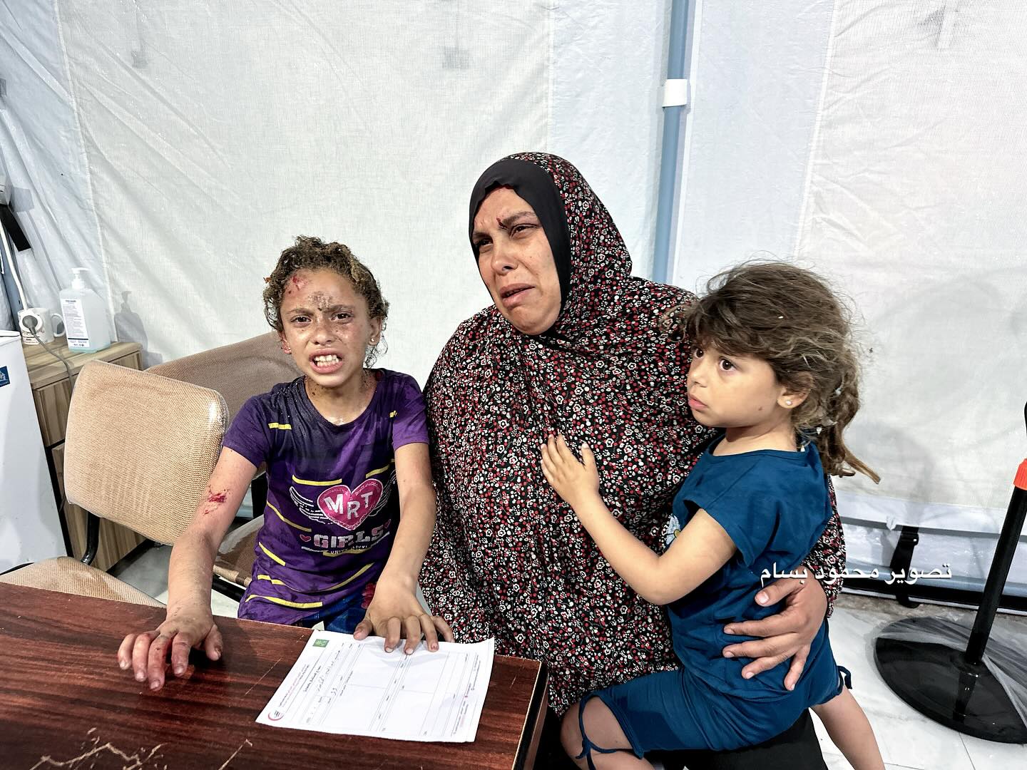 An Israeli airstrike targets a displaced persons’ tent in the Mawasi area of Khan Yunis, causing injuries among children and women, who were transferred to Al-Kuwait Field Hospital for treatment. قصف إسرائيلي يستهدف خيمة نازحين في مواصي خانيونس ويوقع إصابات بين الأطفال والنساء، ونقلهم إلى مستشفى الكويت الميداني للعلاج