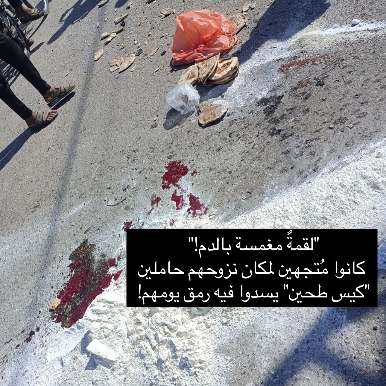 "لقمةٌ مغمسة بالدم!" استهداف دراجة هوائية ومجموعة مواطنين قرب عيادة عبسان الكبيرة شرق خان يونس، حيث كانوا مُتجهين لمكان نزوحهم حاملين "كيس طحين" يسدوا فيه رمق يومهم!