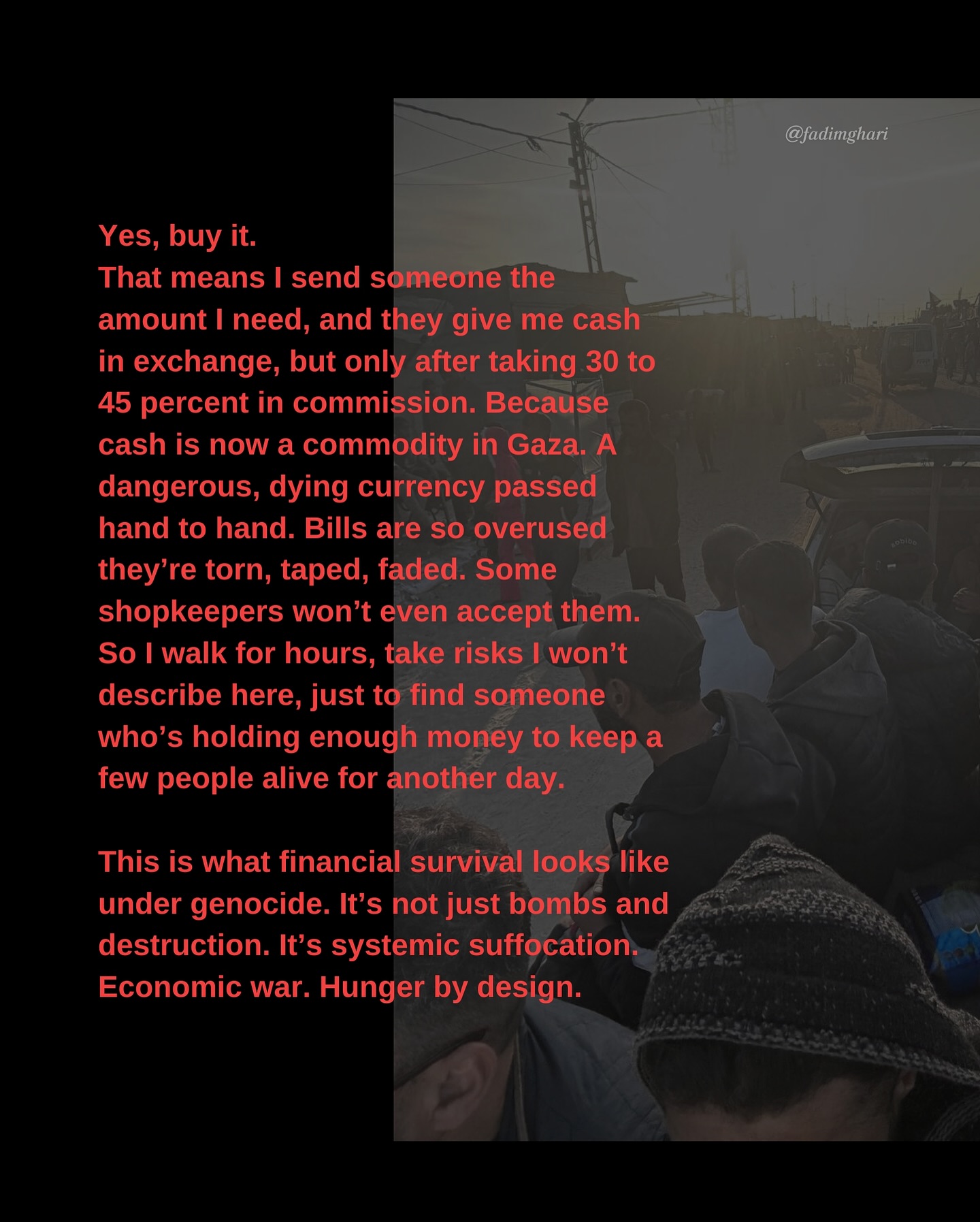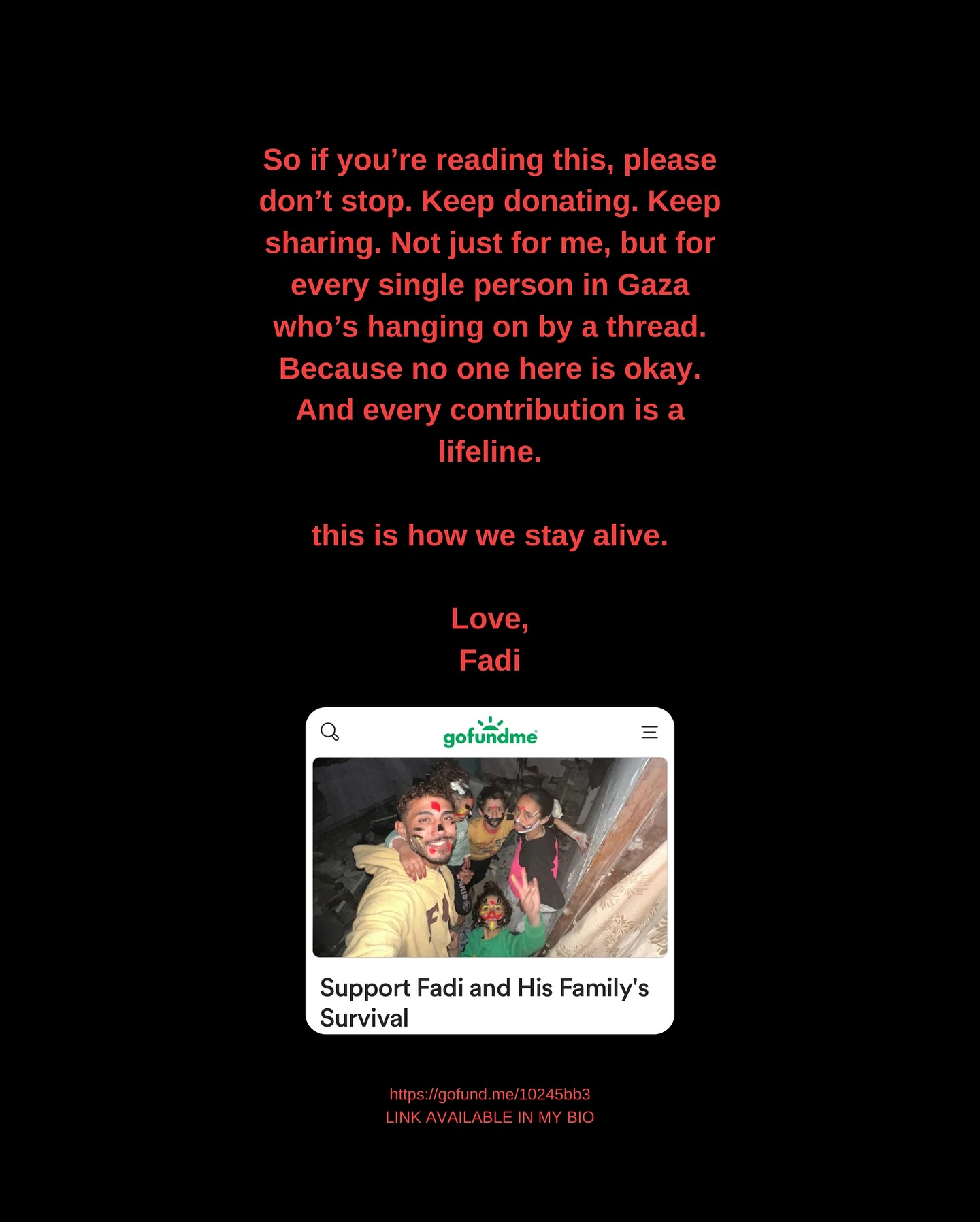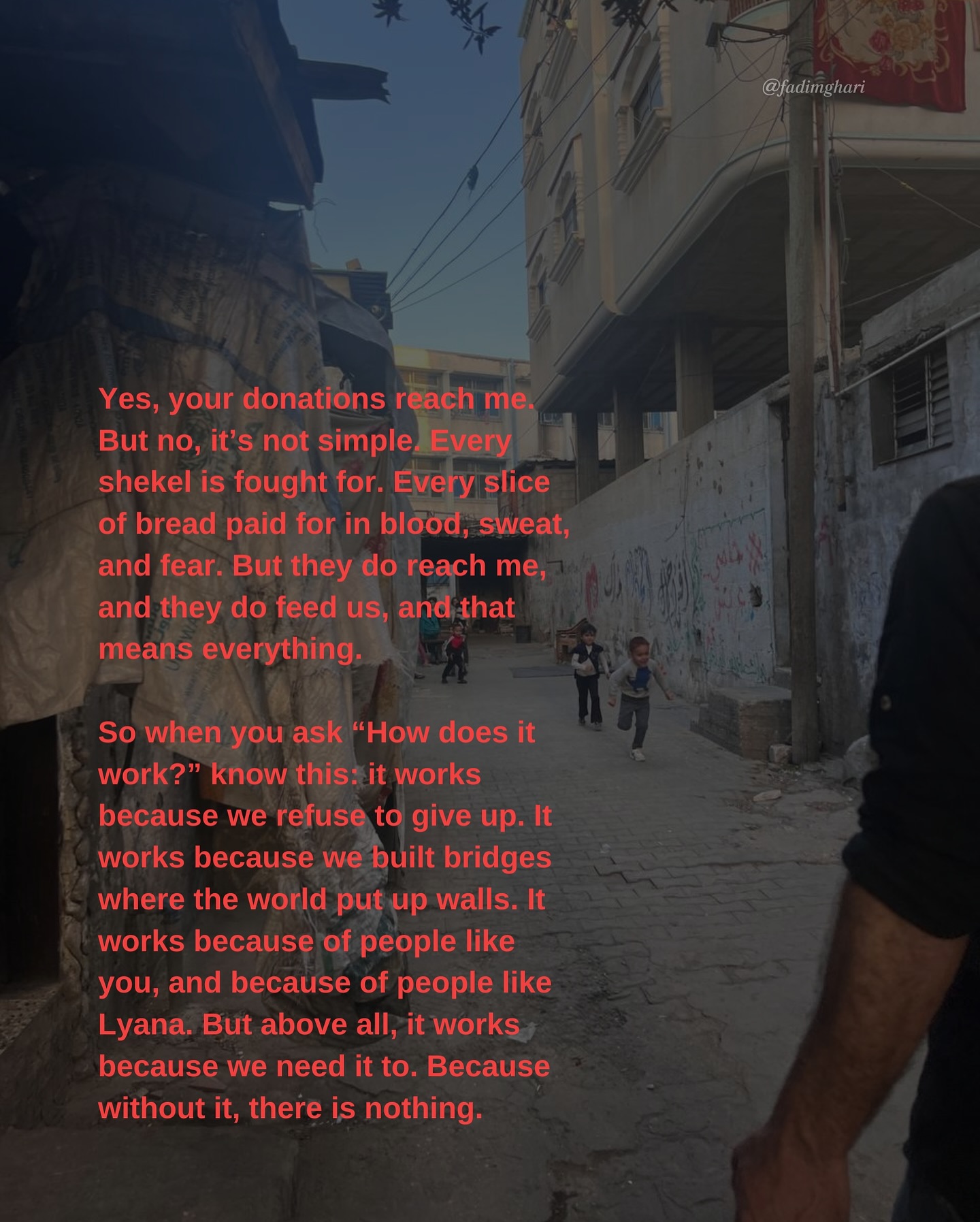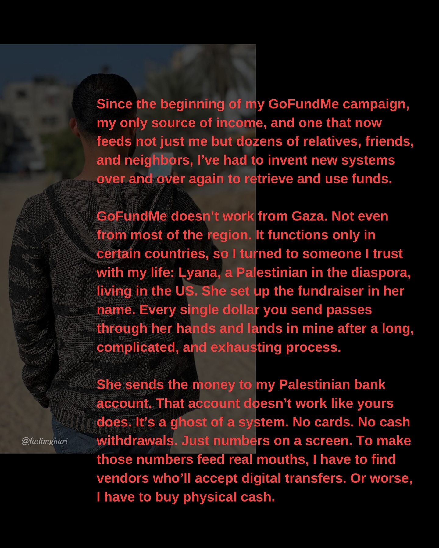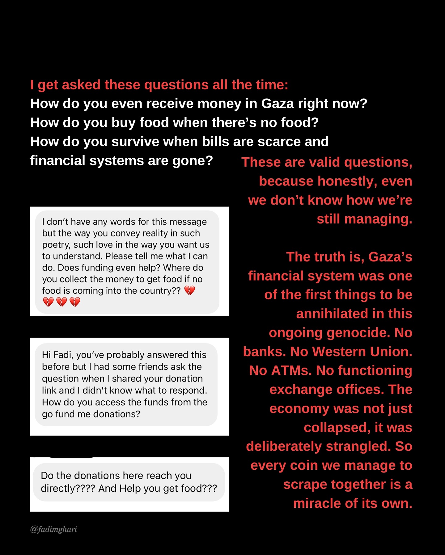You often ask how the money reaches me. The answer is: slowly, painfully, but with love. Through broken systems, long walks, and impossible odds. But it reaches. And it feeds us. Dozens of people, mostly children. So if you’re still giving, don’t stop. You’re part of how we survive. Love, Fadi Gaza Diaries • Fadi Mghari #money #donate #donations #lifeline #support #love #help