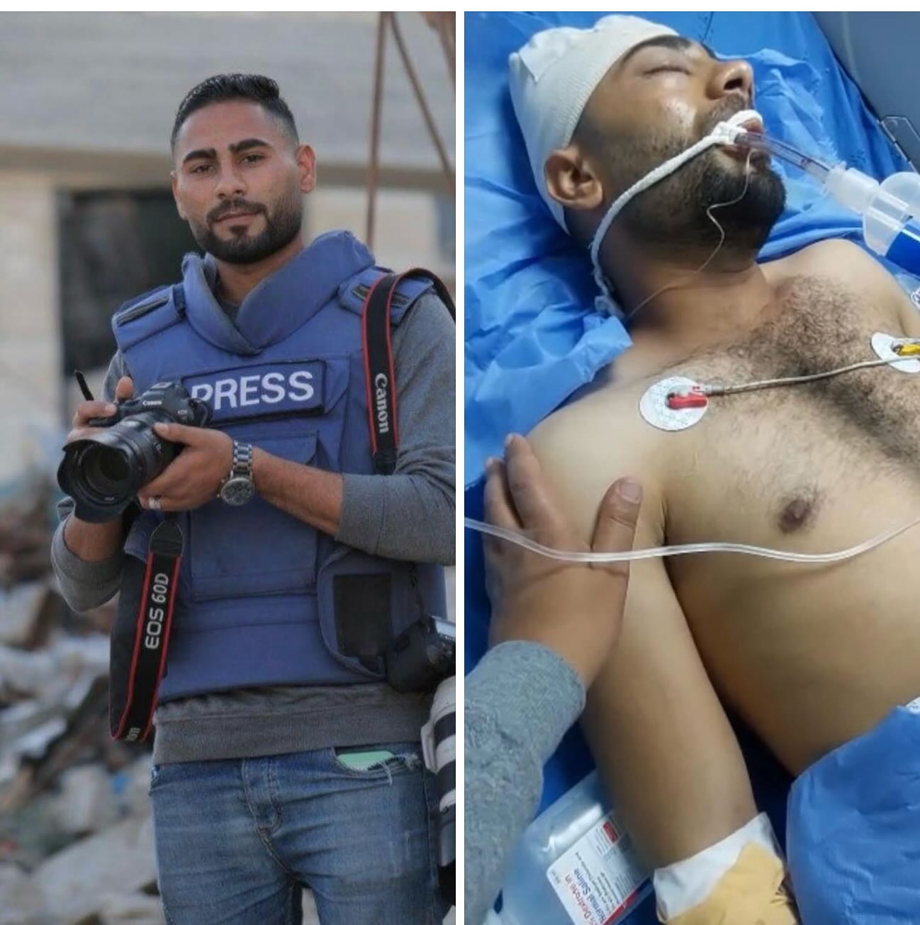 الصحفي الفلسطيني إيهاب البرديني، الذي أُصيب قبل شهر بعد أن استهدف الجيش الاسرائيلي خيمة صحفية مما أسفر عن استشهاد اثنين وإصابة تسعة، قد أفاق من غيبوبته، لكنه لا يزال بحاجة ماسة للعلاج بعد أن فقد إحدى عينيه، لكي لا يصبح إيهاب الضحية رقم 215، عليه أن يغادر غزة لتلقي العلاج. Palestinian journalist Ehab Al-Bardini, who was injured a month ago after the Israeli army targeted a press tent—killing two and injuring nine—has awakened from his coma. However, he remains in urgent need of medical treatment after losing one of his eyes. To prevent Ehab from becoming the 215th victim, he must be evacuated from Gaza for treatment immediately.