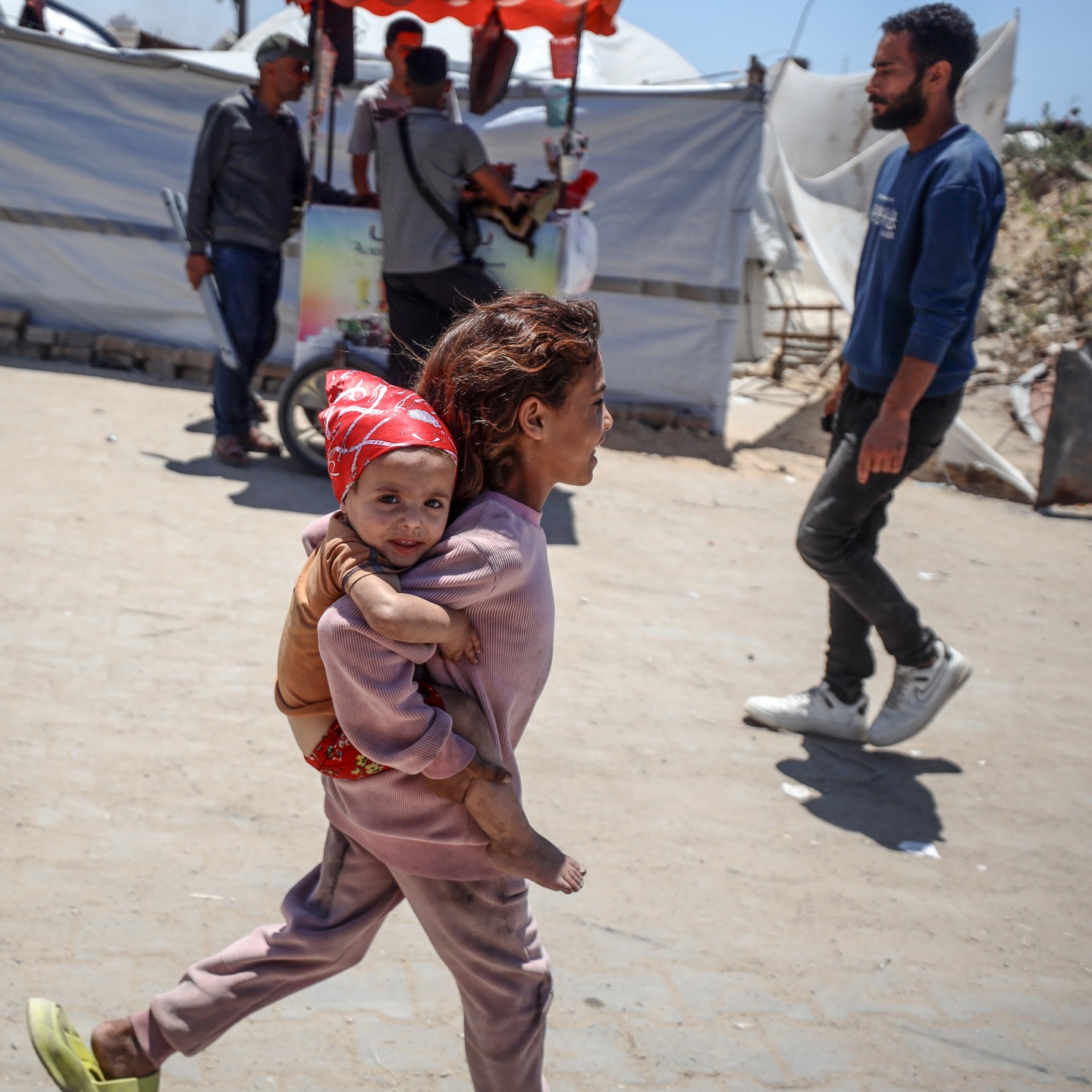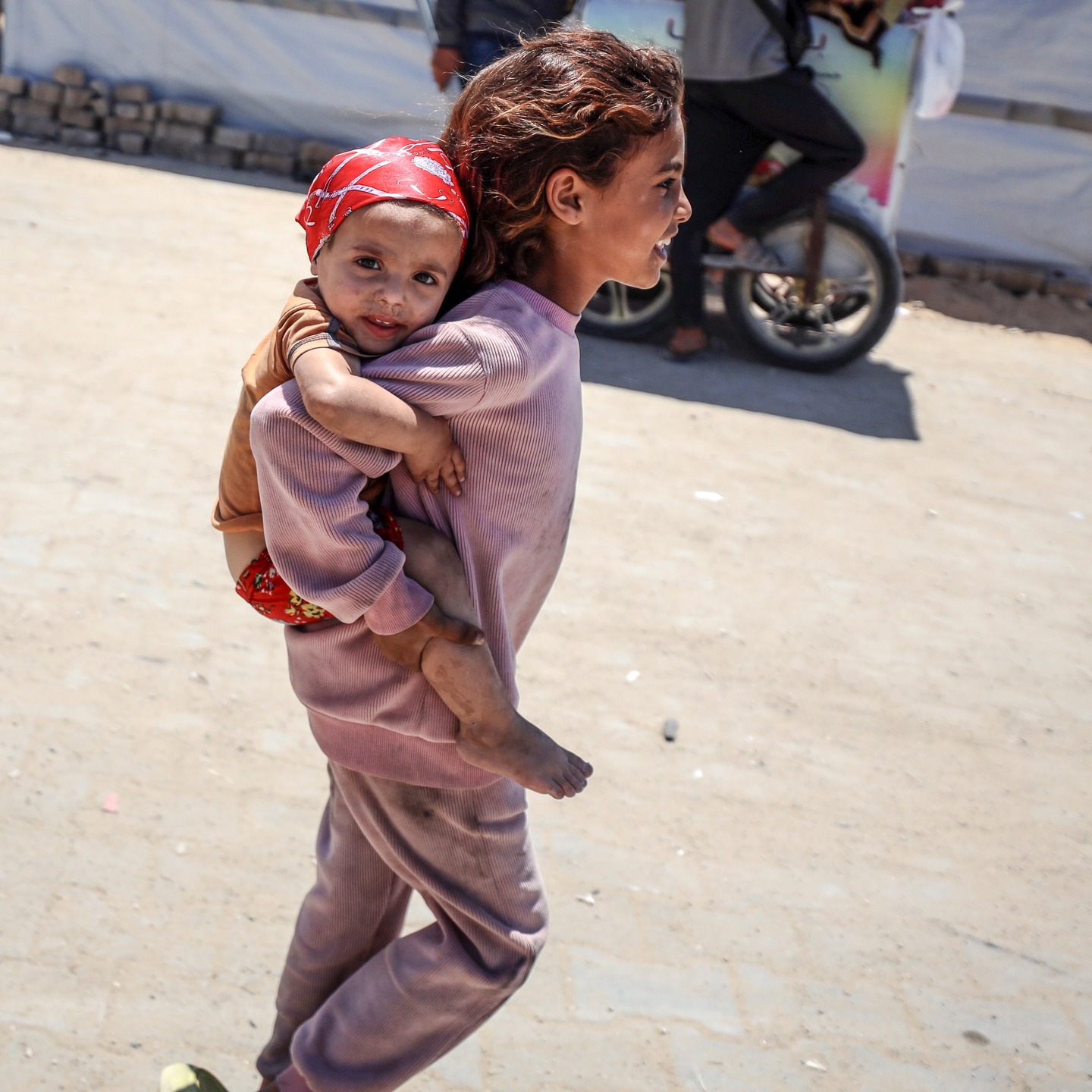 A Palestinian displaced girl carries her sister at a camp for displaced people in Gaza City, on May 21, 2025, photo by majdi fathi