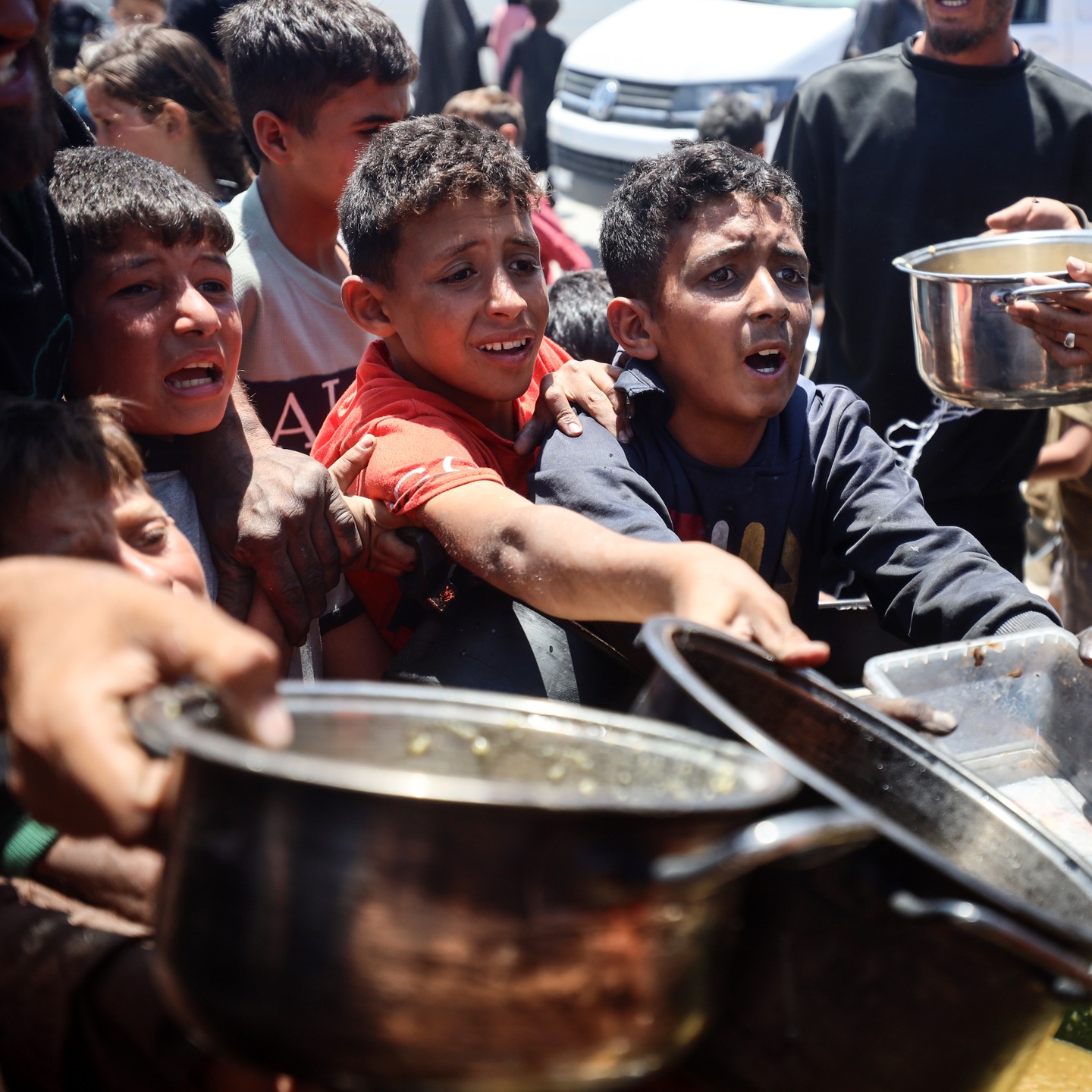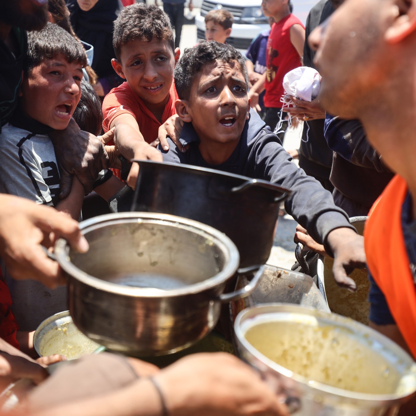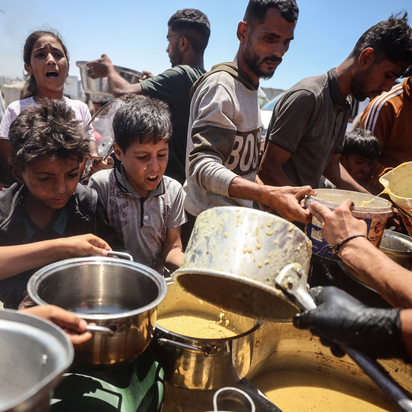 Palestinian youths shove to get a ration of hot food from a charity kitchen set up at a camp for displaced people in Gaza City, on May 21, 2025, photo by majdi fathi