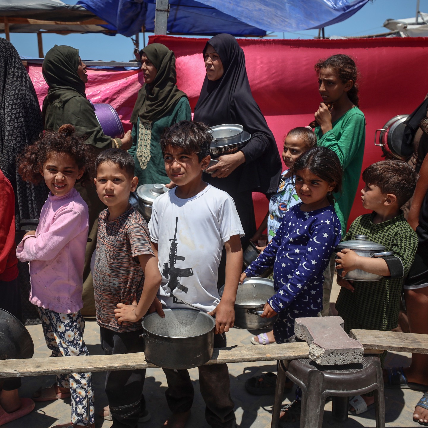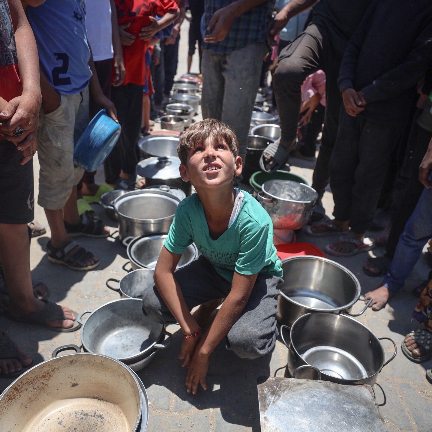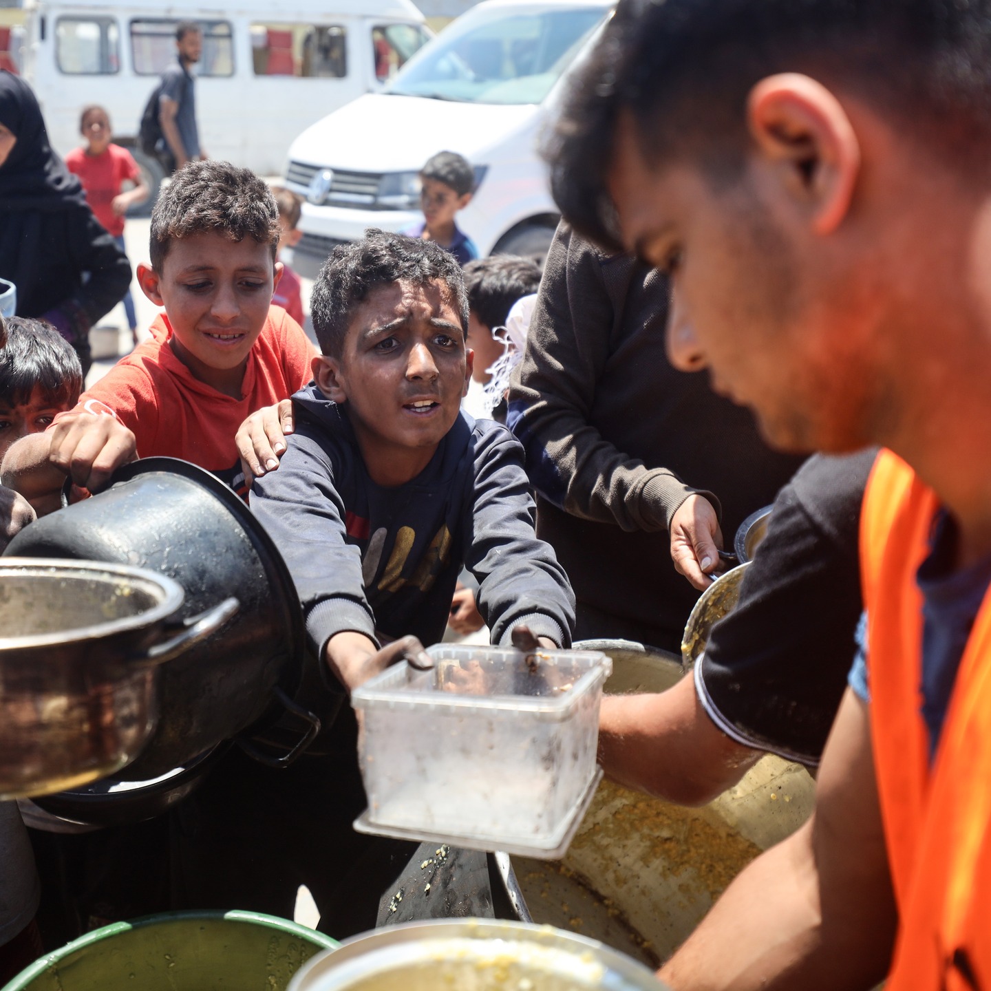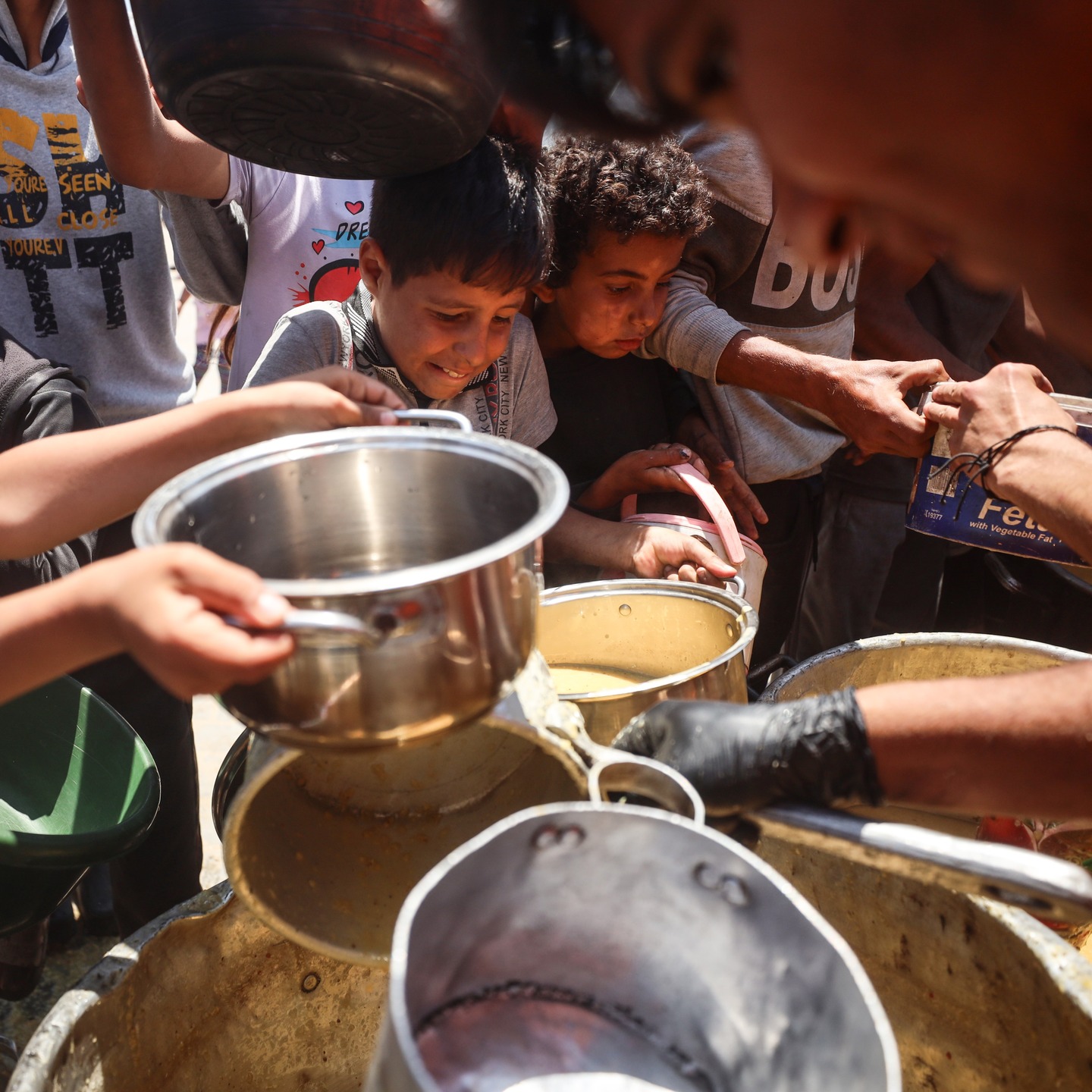 Palestinian youths shove to get a ration of hot food from a charity kitchen set up at a camp for displaced people in Gaza City, on May 21, 2025, photo by majdi fathi