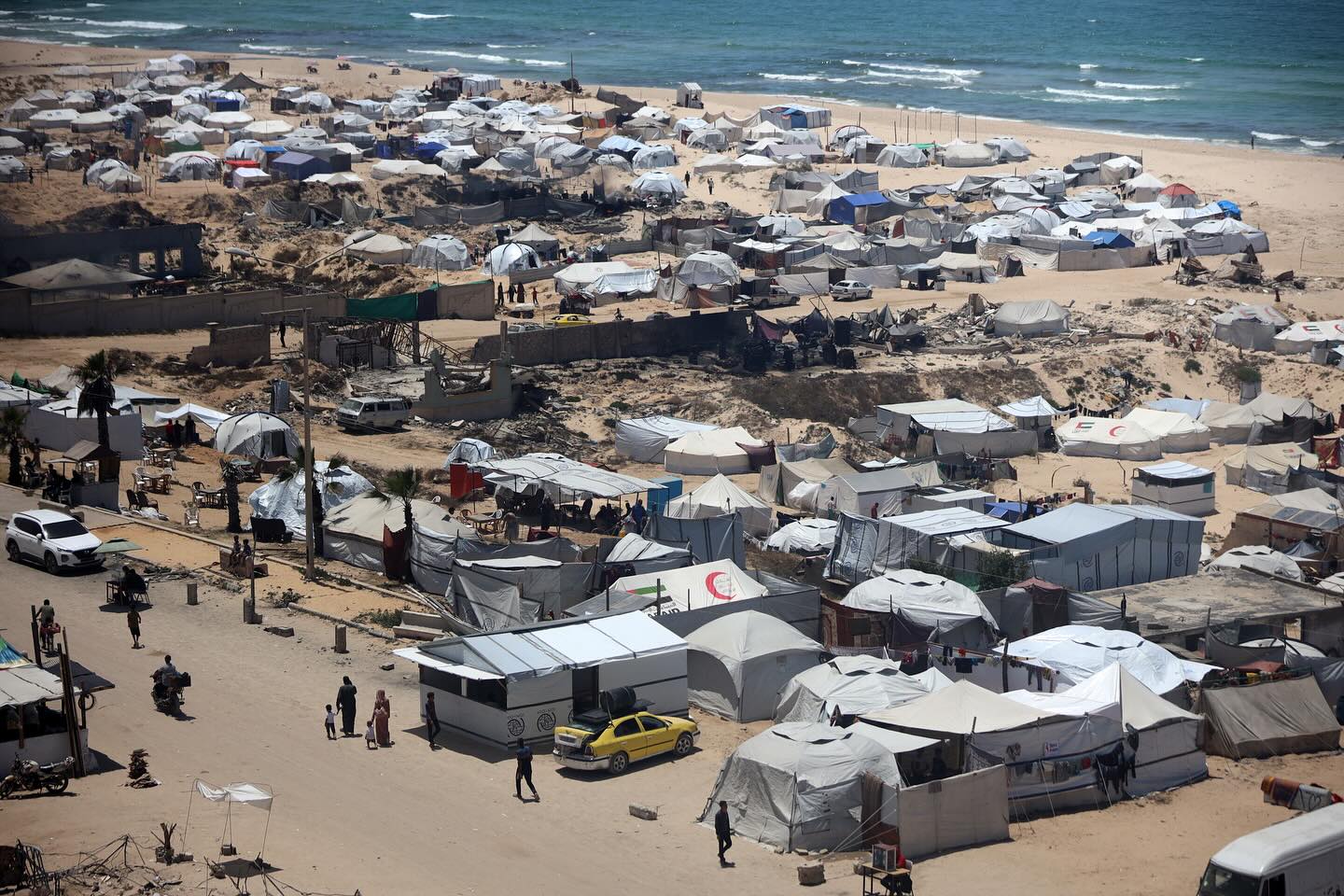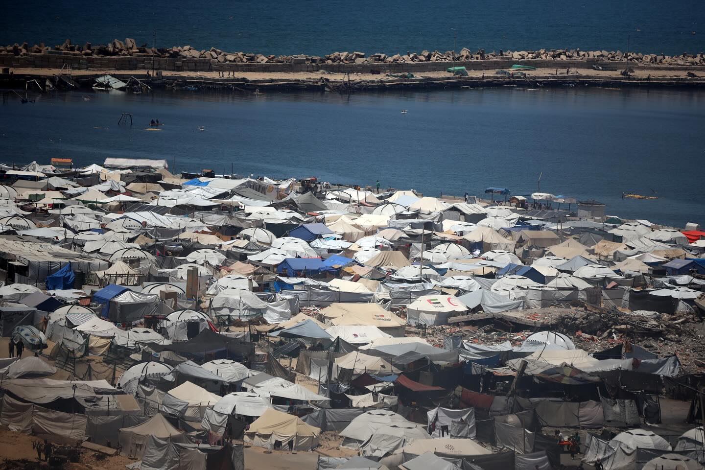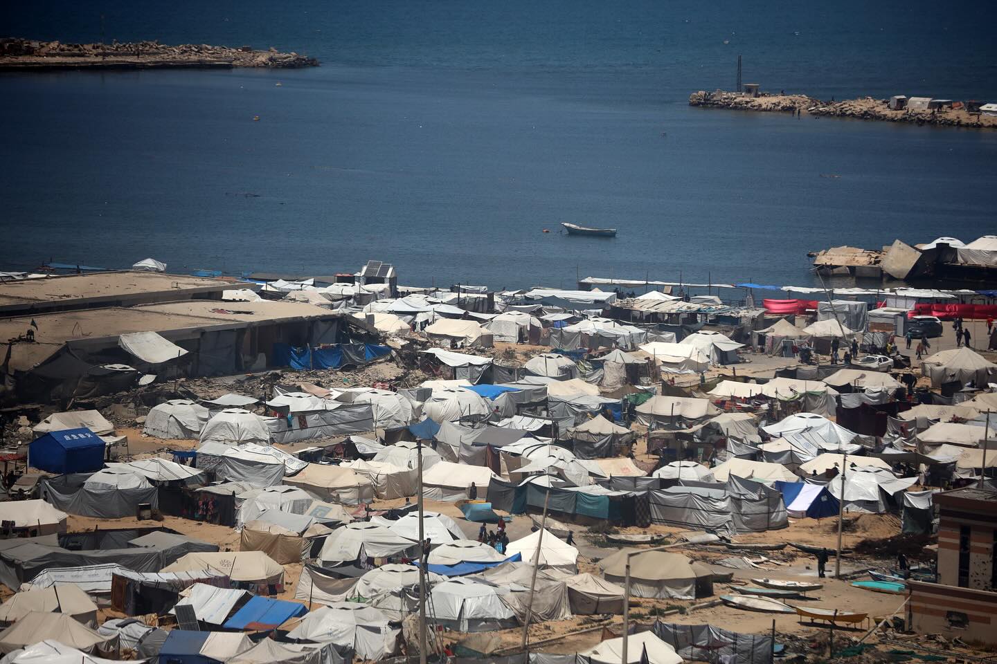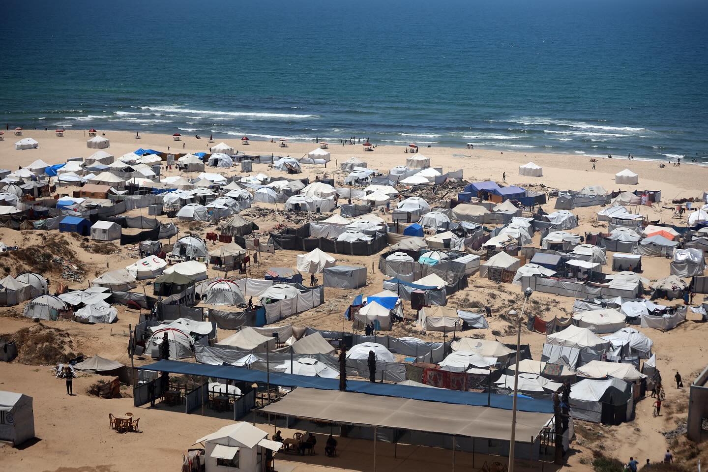 Tents are set up as temporary shelters for displaced Palestinians along the coastline of Gaza City on May 25, 2025. Photo by majdi fathi