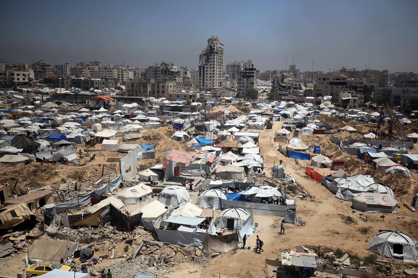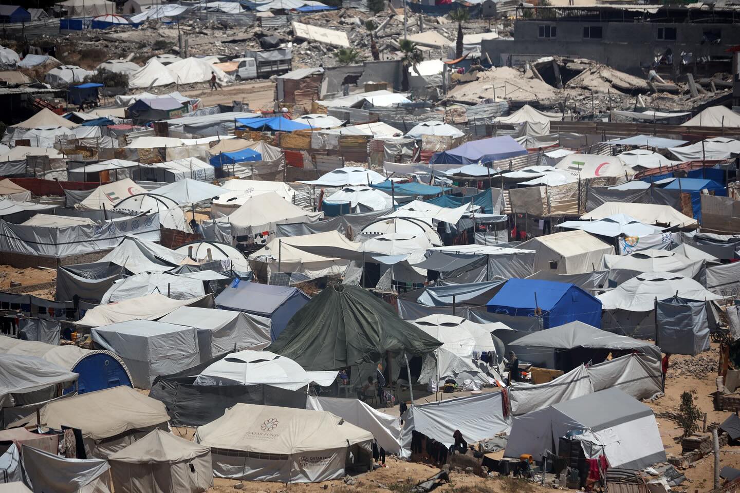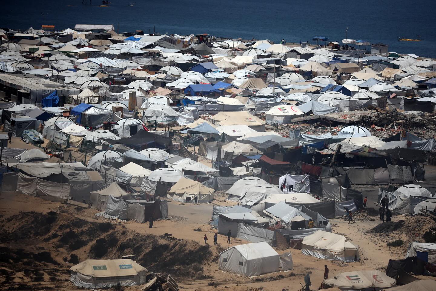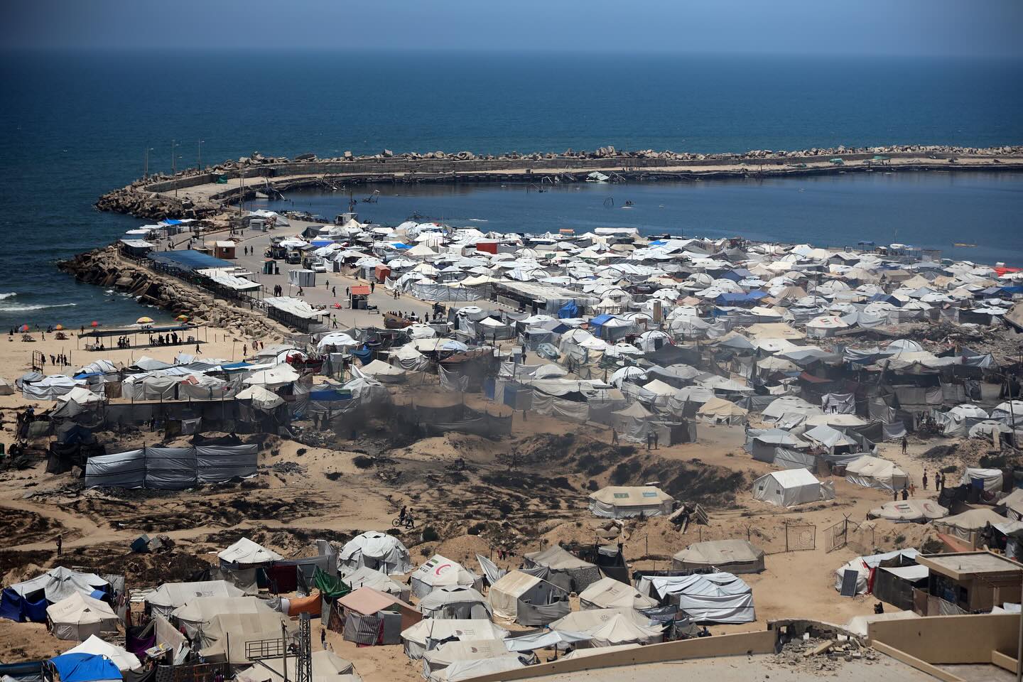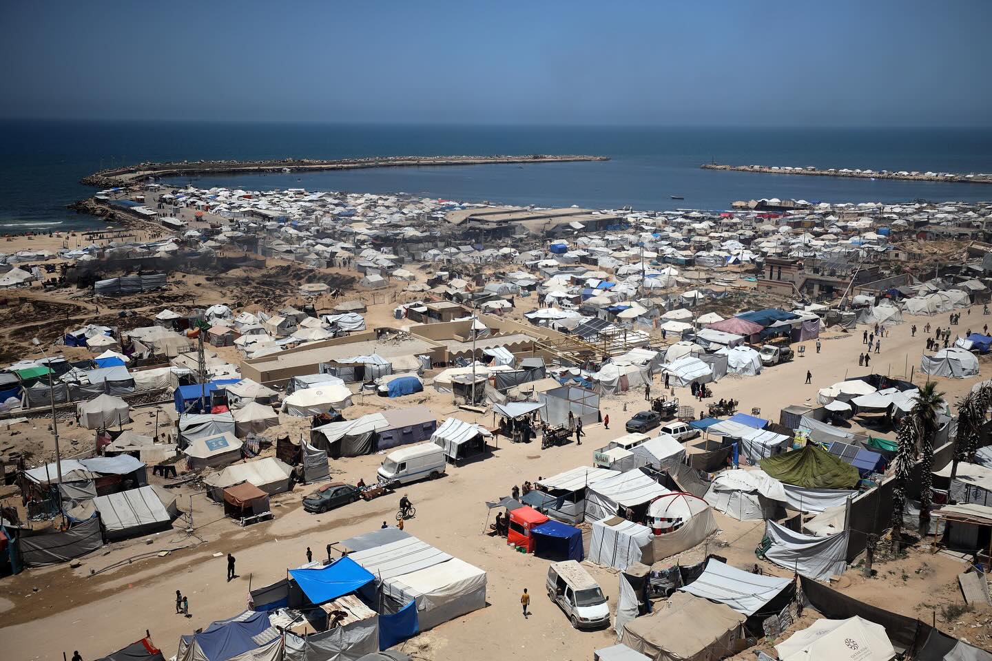 Tents are set up as temporary shelters for displaced Palestinians along the coastline of Gaza City on May 25, 2025. Photo by majdi fathi