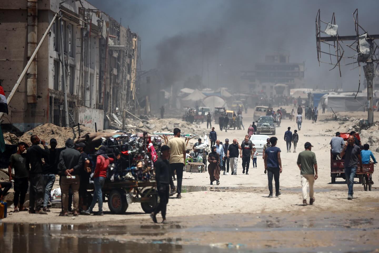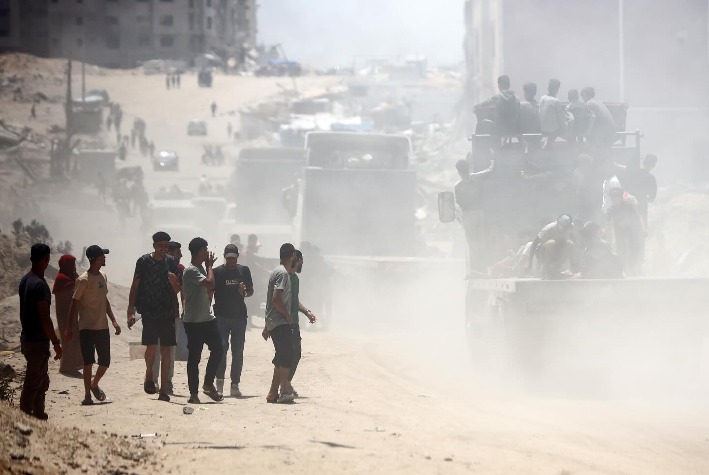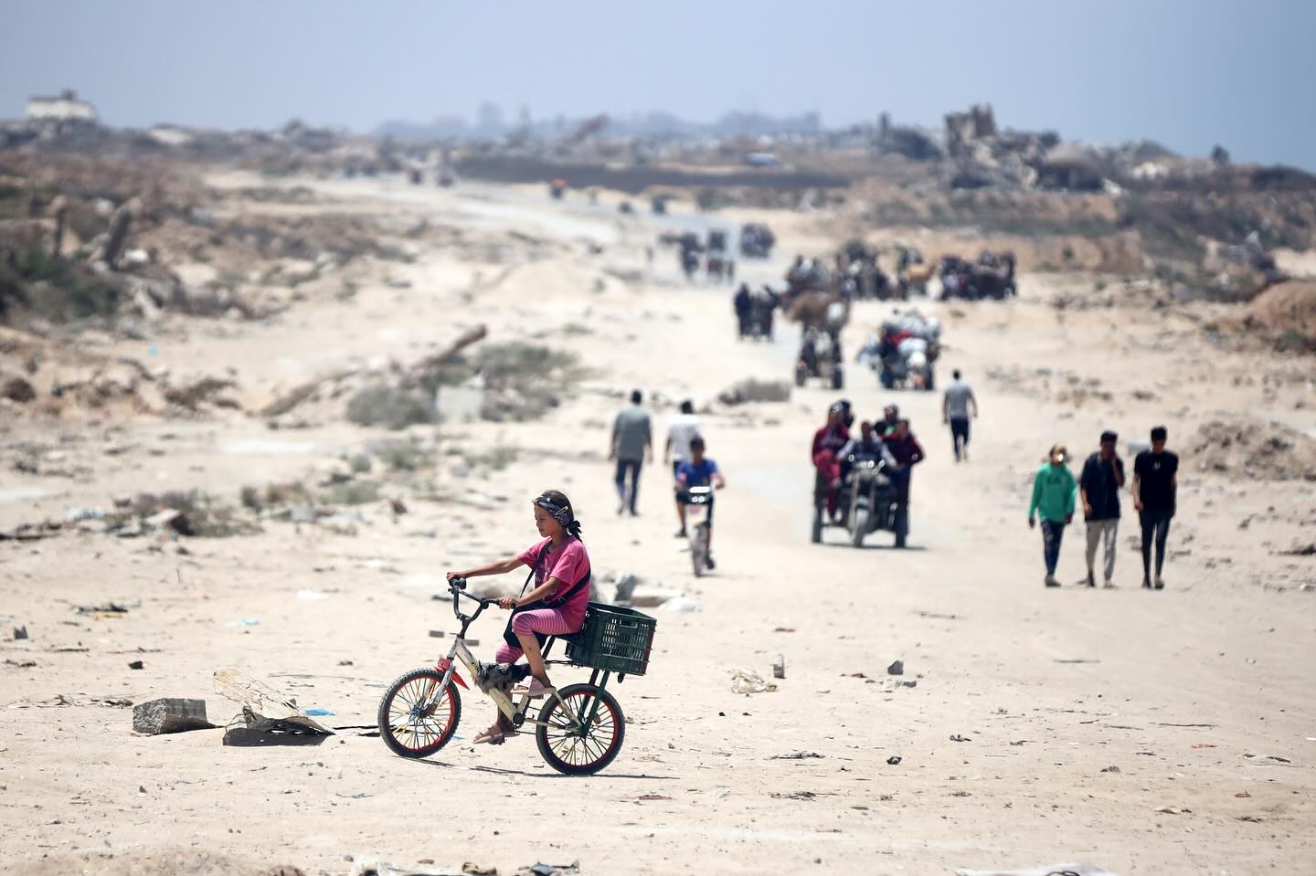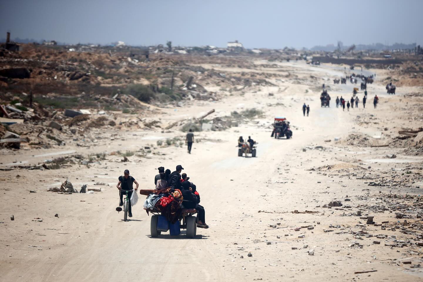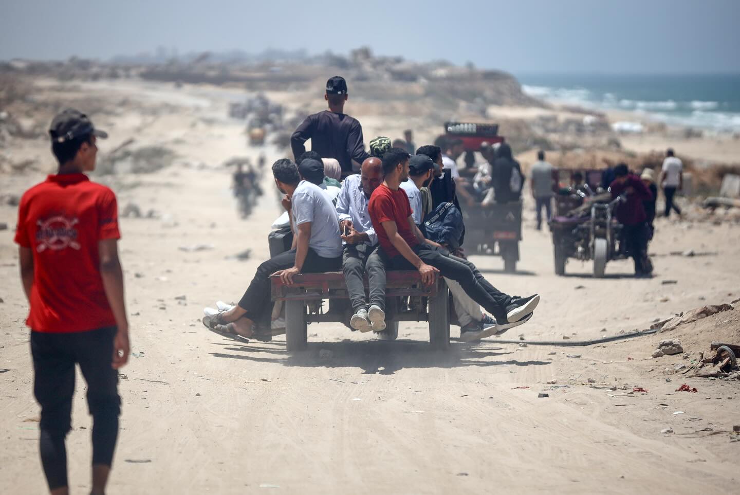 Palestinians transport their belongings as they flee the northern Gaza Strip toward the south, along the coastal al-Rashid road on May 25, 2025. Photo by majdi fathi